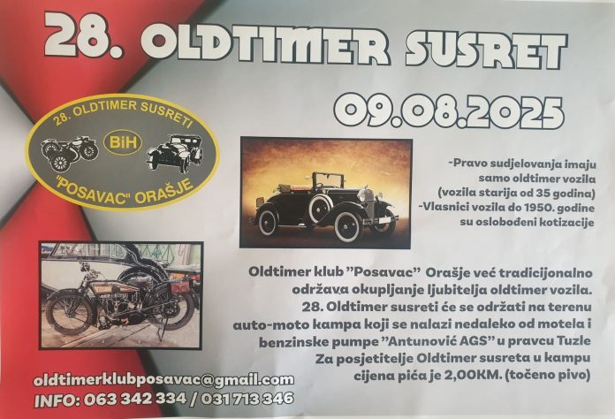 U Orašju će u subotu (09.08) biti održani tradicionalni 28. Oldtimer susreti u organizaciji Oldtimer kluba Posavac Orašje. Najdugovječnija manifestacija te vrste u našoj zemlji, okupit će brojne sudionike iz naše zemlje i okruženja, kazao je predsjednik OK Posavac Kruno Draganović, te podsjetio kako su lani susreti okupili više od stotinu vlasnika vremešnih dvo i četverokatačnih ljubimaca. Draganović je pozvao vlasnike starih traktora i bicikala da ih izlože u Moto kampu, a sve građane da posjete ovu jedinstvenu manifestaciju. Za sudjelovanje na susretima prijaviti se mogu sva vozila starija od 35 godina, uz kotizaciju 20 eura. Zanimljivo je da su vozila proizvedena do 1950. godine oslobođena plaćanja kotizacije. Organizator svake godine nastoji ponuditi zanimljiv program, pa će u 12 sati započeti defile u dužini 25 km u pravcu Muzeja Franjevačkog samostana Tolisa „Vrata Bosne“. Nakon toga odlazak u središte Matića na osvježenje, a u nastavku slijedi vožnja u pravcu Kostrča, D.Mahale, Ugljare i Orašja do stadiona GOL, gdje je predviđen ručak. Povratak sudionika u kamp MK Posavac na Dusinama, gdje će biti upriličena dodjela pokala i ostalih nagrada, očekuje se oko 16 sati.