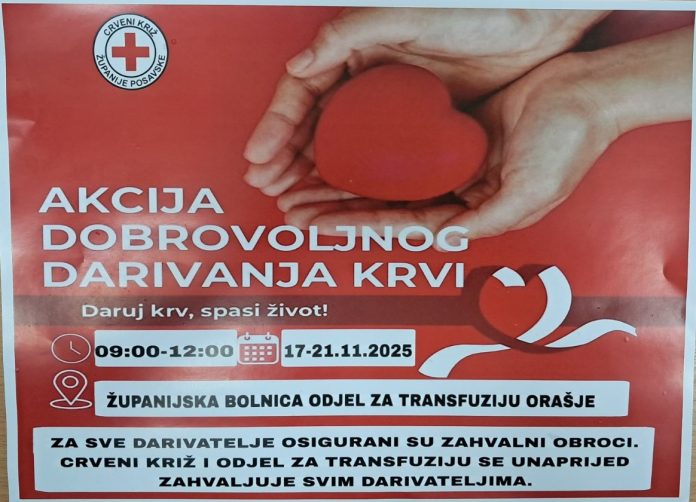 S ciljem osiguranja dovoljnih zaliha krvi u zdravstvenim ustanovama u Županiji Posavskoj i podizanja svijesti javnosti o važnosti darivanja ove najdragocjenije tekućine, koja život znači, Crveni križ ŽP u suradnji s Odjelom za transfuzijsku medicinu Županijske bolnice Orašje organizira ovoga tjedna akciju dobrovoljnog darivanja krvi. Za sve darivatelje, osigurani su zahvalni obroci, a krv se može dati svakim danom, zaključno s petkom 21. ovoga mjeseca u vremenu od 9 do 12 sati. Neophodne su sve krvne grupe, te su pozvani svi punoljetni zdravstveno sposobni građani da se uključe u ovu plemenitu akciju i pomognu onima kojima je ova pomoć potrebna. Jedna doza spašava tri života, podsjećaju organizatori ove akcije.
